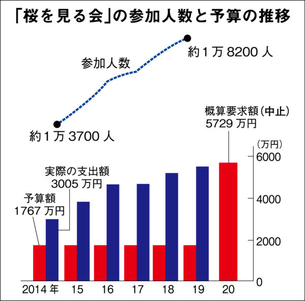 その招待者の数が、第二次安倍政権発足後の2014(平成26)年から右肩上がりに増え、5年間で2倍近くに膨れ上がった。それにともなって公費支出も固定予算である1767万円の2~3倍にのぼる予算超過が常態化し、ついに2020年度は従来予算の3倍にのぼる5729万円を概算要求していた【グラフ参照】。支出(2019年度)の内訳は「飲食物提供」が2261万5000円で最も多く、「会場設営等」に2167万円、「消耗費・備品」が625万3000円、「案内状等」に464万9000円(2014年度の2・5倍)だ。
