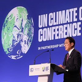 COP26での演説で岸田首相は、2030年度の温室効果ガスの国別削減目標については「13年度比46%削減をめざし、さらに50%削減の高見に向け挑戦を続けていく」ことを約束すると表明した。さらに岸田首相は途上国の温暖化対策支援として新たに今後5年間で最大100億㌦の追加資金援助をおこなうことを表明し、「アジアは世界の経済成長のエンジン」であり、気候変動対策の負担を日本が財政・技術面で支援していくとした。