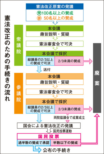 手続きの流れ【図参照】を見ると、衆参両院で可決した先には国民投票がある。国会と国民投票の二段階だ。国民投票では「賛成投票の数が投票総数の2分の1をこえた(過半数)場合」に憲法改正手続きが始まる。