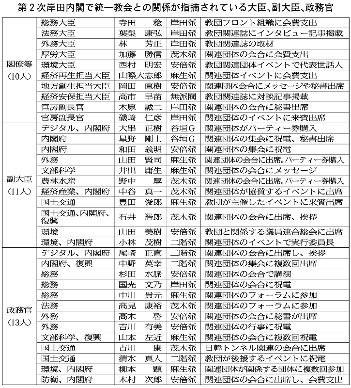 A 報道や世論の変化で泡を食っているのが岸田政府で、支持率低迷に慌てふためいて内閣改造を1カ月前倒し、自身を除く19閣僚のうち統一教会との関係を認めた閣僚7人を交代させ、閣僚や副大臣や政務官に対しても「教団との関係を点検・見直すことを求め、了解した者のみを任命した」と説明した。だが、フタを開けてみると、政務三役(大臣・副大臣・政務官)のうち少なくとも30人以上が統一教会と何らかの接点をもっていたことが明らかになっている。閣僚級では10人、そして副大臣、政務官54人のうち半数を占める24人にのぼる【表参照】。