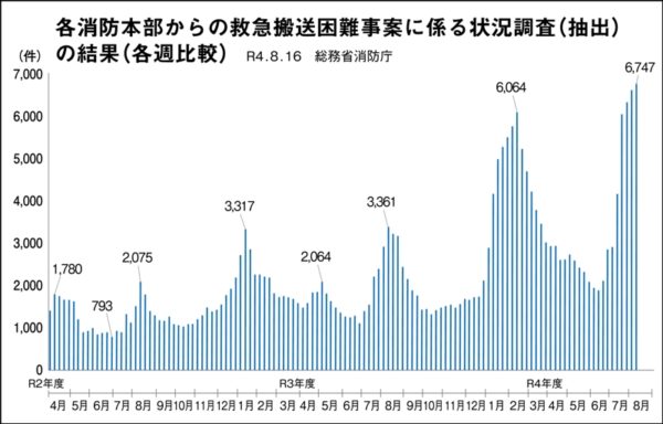 また、心不全を患う80代の陽性患者が自宅で容体が急変し、救急要請したが5時間以上も搬送先が見つからず、自宅療養を続けたという例もある。同じく10時間以上も救急車のなかで救命措置を受けた患者がついに力尽きるという事例も出ている。