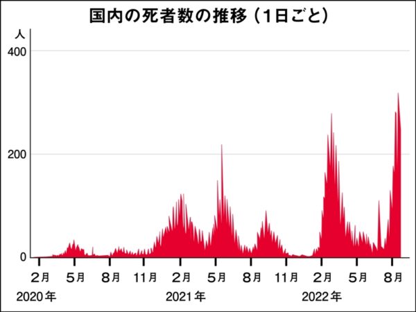 第6波(今年1~6月)は6カ月間で1万2888人が亡くなった。第7波(7月~8月18日)の死者数は2カ月足らずで5008人であり、過去最多の死者数が出るペースだ。