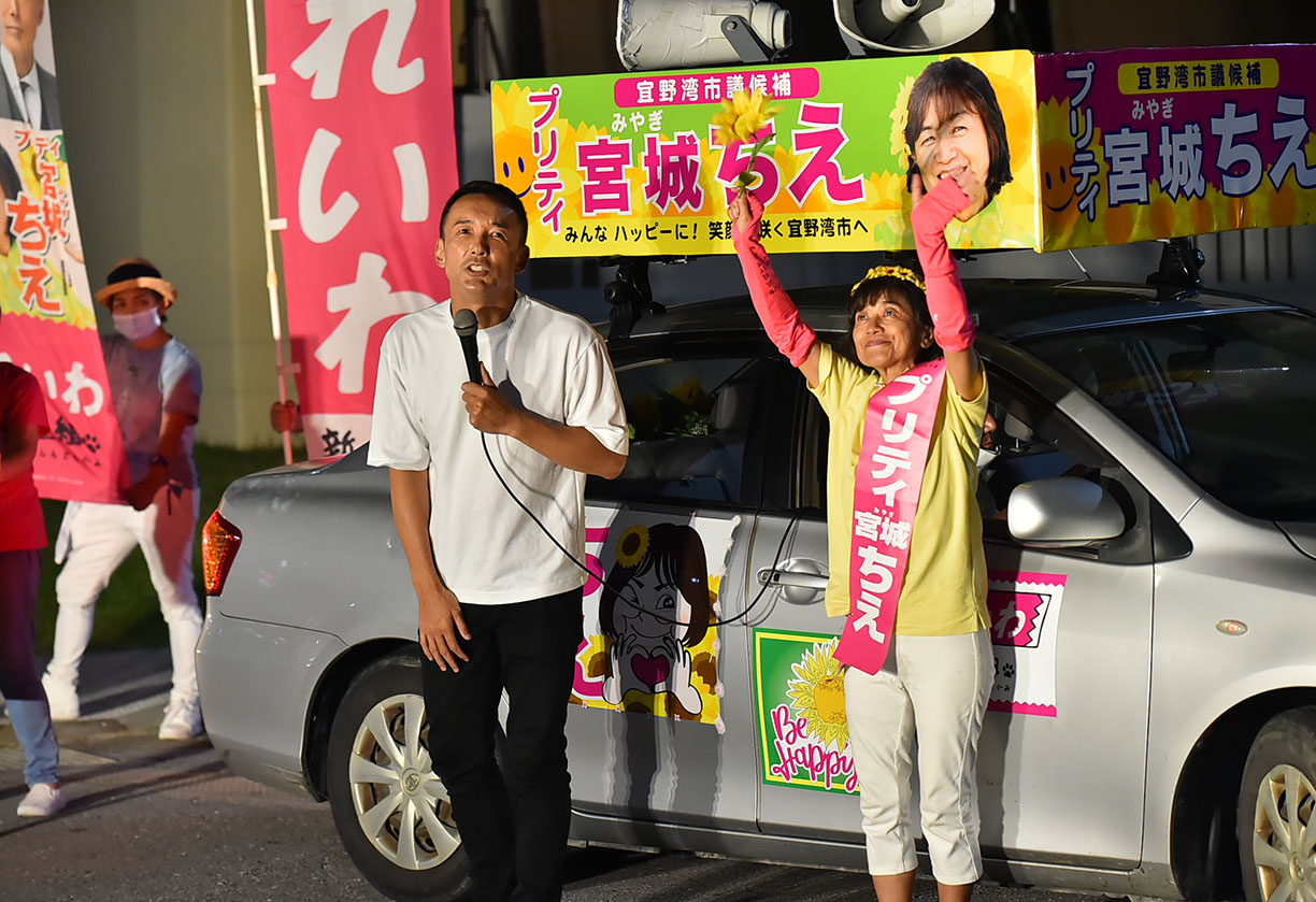 宜野湾市議選に挑むプリティ宮城ちえと応援に入った山本太郎