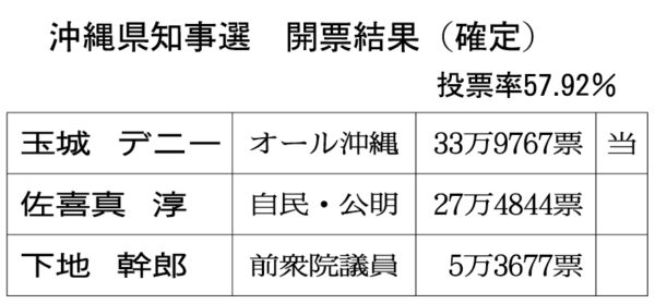 開票結果は、玉城デニーが33万9767票、佐喜真淳が27万4844票、下地幹郎が5万3677票で、オール沖縄が推した玉城デニーと自民党政府が推した佐喜真淳の票差は6万4923票となった。投票率は57・92%で、前回(63・24%)をやや下回った。