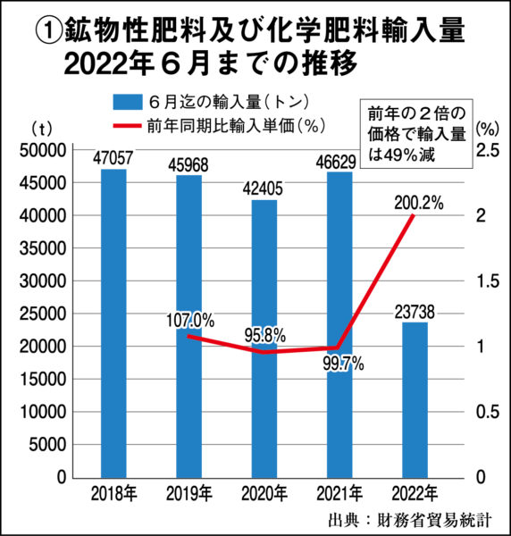 最たるものが化学肥料原料で、日本はリン、カリウムを100%、尿素も96%を輸入に依存しているが、最大調達先である中国は国内需要が高まったため輸出を抑制。カリウムについては、中国と並ぶ大生産国のロシアとベラルーシに依存していたが、いまや日本は敵国認定され、輸出してくれなくなった。値段も2倍になっているが、高くて買えないどころか原料が入らず、製造中止の配合肥料も出てきて、今後の国内農家への化学肥料供給の見通しが立たなくなってきている【グラフ①参照】。