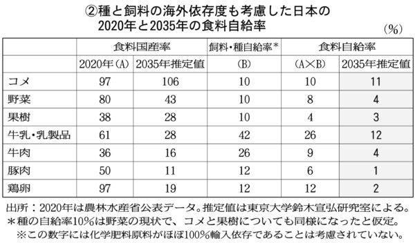 このままだと2035年には、飼料の海外依存度を考慮すると牛肉、豚肉、鶏肉の自給率はそれぞれ4%、1%、2%。種の海外依存度を考慮すると野菜の自給率は4%と、信じがたい低水準に陥る可能性さえある【表②参照】。今は国産率97%のコメも、いずれ野菜と同様になってしまう可能性も否定できない。