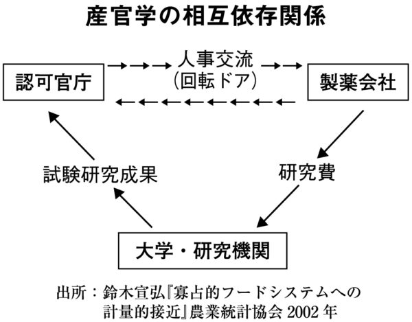 私は農水省職員時代、このホルモン剤の安全性を追って渡米したが、認可官庁も製薬会社も研究機関の大学教授も、まるで同じテープを聴いているかのように同じ言葉をいっていて驚いた。よくみると、安全性を審査する研究機関は製薬会社から巨額の研究費をもらっており、その製薬会社と認可官庁は人事交流(回転ドア)で一心同体の関係という「疑惑のトライアングル」ができあがっている。