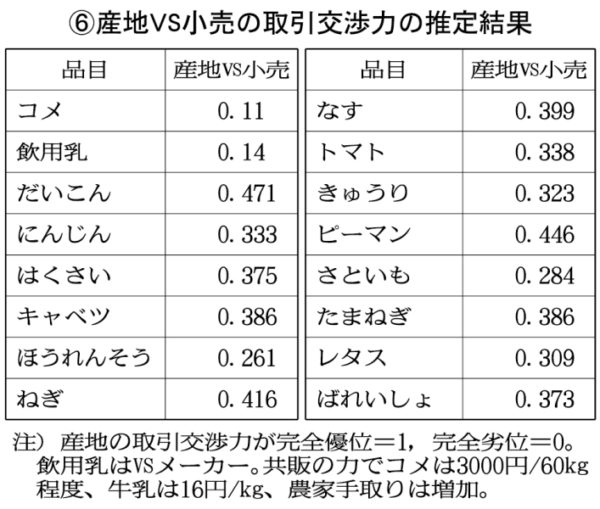 つまり小売大手が強すぎて、全品目が買い叩かれている【表⑥参照】。上の表で、数値が0・5を下回れば農家が買い叩かれていることを示している。仲卸業者によれば「まずイオンがいくらで売るかを決め、そこから逆算して農家にいくら払えるかが決まる。それがすべてで、農家のコストは関係ない」という。これでやっていけるわけがない。