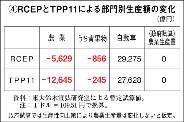 政府が使っている計量モデルで実際に計算すると、TPPやRCEPなど大きな貿易自由協定を一つ決めるごとに自動車は3兆円もうかり、農業は1兆数千億円の損失というふうに膨らんでいくシステムになっている【表④参照】。