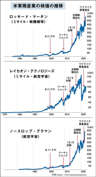 たとえばロッキード・マーチン(世界最大の米兵器メーカー・戦闘機などの航空機等)の株価は、9・11テロ事件後から上がり続け、リーマン・ショックで一旦下がるものの、その後は中東でISIS(イスラム国)が台頭したことで上がり、北朝鮮情勢が緊迫するだけでも株価が上がる。現在ウクライナの戦争に至るまで、とにかく右肩上がりだ。