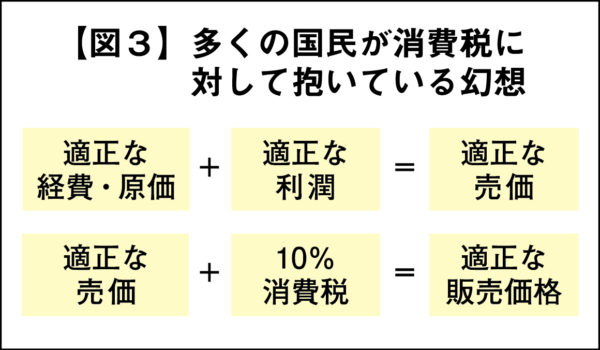 しかも、消費税にはなんとなく多くの国民が抱いている幻想がある。消費税はこの幻想、ファンタジーの世界でなくては成り立たない税である。それはどういうことか。一般的には消費税のイメージは上記のようになっている【図3】。