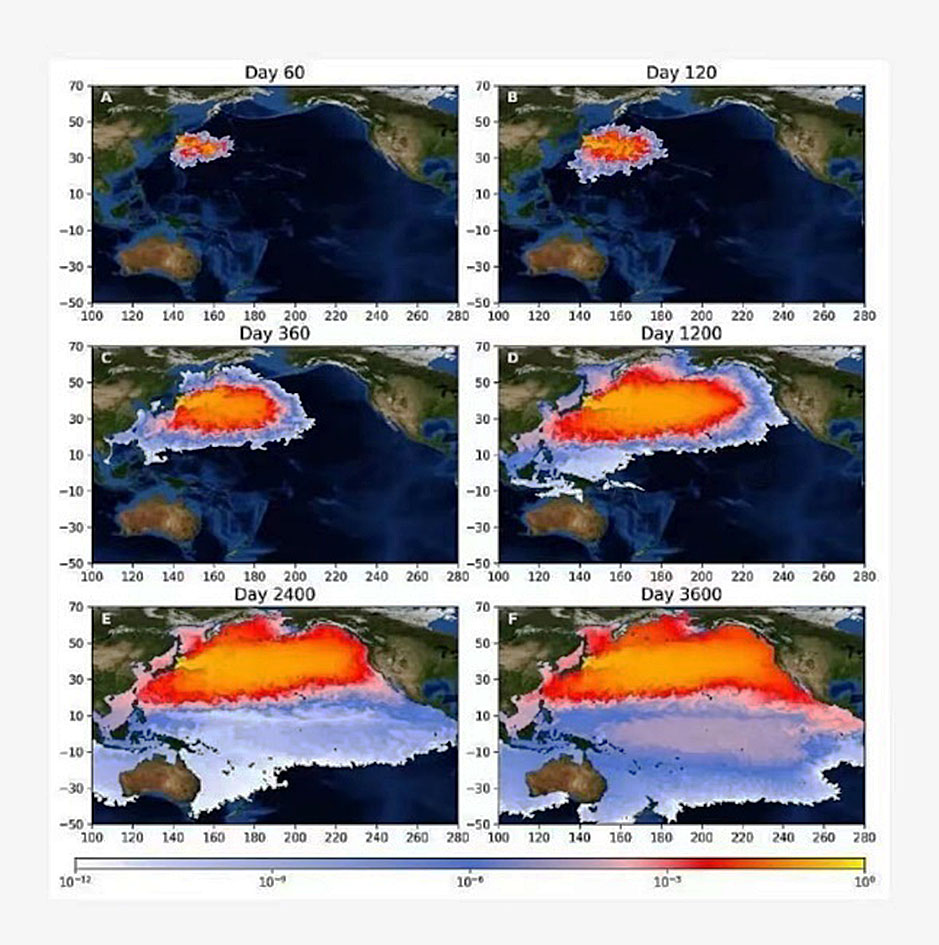 中国・清華大学の研究チームが発表した長期マクロシミュレーションでは、福島原発から汚染水を海洋放出した場合、汚染水は約240日で中国の沿岸海域に到達し、1200日後には北米沿岸に到達するとともに北太平洋のほぼ全域に広がることが明らかになっている。その結果から、「汚染水放出後の初期には、主としてアジア沿岸への影響を考慮すべきだが、後期には、北米沿岸海域の汚染物質濃度が東アジア沿岸海域の大部分より高い状態が続くため、北米沿岸海域が受ける影響に重点的に注意を払う必要がある」と指摘している【下図参照】。