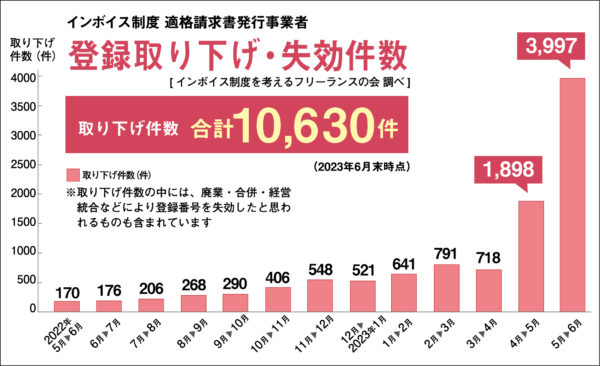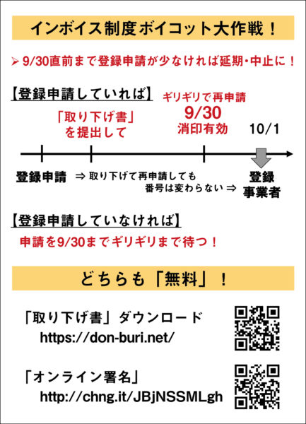 インボイス制度を合法的にボイコットする方法がある。名付けて「インボイス制度ボイコット大作戦!」だ。ポイントは二つあり、その一つは「9月30日ギリギリまで登録しないで様子を見る」ということ。もう一つは登録してしまった事業者は「取り下げる」ということ。お金を吸い上げられて潰れたいのであれば、早めに登録申請をしてそのままにしていればいいが、お金を吸い上げられるのが嫌だったり潰れたくないのであれば、そのような事業者がみんなでこの「ボイコット大作戦!」(「ギリギリ登録」と「取り下げ」)をすれば、登録者が少なくなり制度自体が成り立たずに延期・中止になる可能性が高くなるというもの。ちなみに「ボイコット大作戦!」は免税事業者に限った話ではなく課税事業者も同様だ。筆者も課税事業者だが「取り下げ」をした。いま反対の意思表示として「取り下げ」をしている事業者が増えてきている。インボイス制度を考えるフリーランスの会が独自に集計したところ「取り下げ」件数が6月末時点で累計1万件を超え、制度の導入に揺さぶりをかけている。