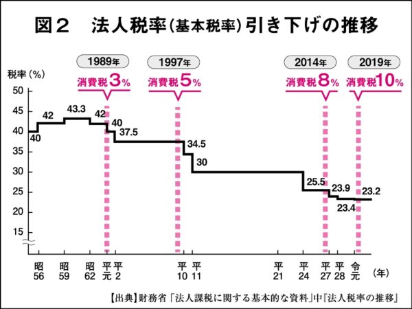 資本家にとってのコストは「労働者」と「税金」だが、昭和の終わりから平成の終わりまで法人税が減税され続けている。そしてそれは消費税増税のタイミングで法人税が減税される仕組みになっている【図2】。今テレビを見ている皆さんから搾りとられた消費税は、その一部しか社会保障に使われていない。庶民には増税して社会保障負担を上げまくり、資本家がよりもうかるよう法律を作り変える。その結果大企業の内部留保は10年以上過去最高益を更新し続けており、大企業の現金預金はリーマンショック後から右肩上がりになり、昨年時点で295兆円となった。10年間で約127兆円も増えている。