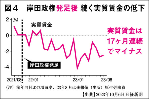 てのひら返しはまだまだ続く。総理は「所得倍増」をひっさげて総裁選に勝利したが、政権発足から実質賃金は倍増どころか落ち込み続けている【図4】。そこで一発逆転と、総理が最低賃金1500円に引き上げると宣言した。ちなみに10年後の話だ。いい加減にしてもらえないか。今から10年間も総理で居続けることが難しい人が、「10年後に最低賃金1500円」とうち出すことを、“空手形”という。