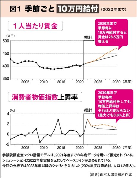▼季節ごと(年4回)、1・2億人に10万円を給付すると、何もしなかった場合に対し1人当り賃金は6年後に約28・5万円増える。物価は2年後に1・9%まで上昇するがその後上昇率は低下し、6年後には1・3%程度になる。給付金は公共投資と違ってすぐに消費に回らないため、物価はさほど上昇しない【図1】。