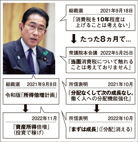同じく、総裁選のときには「金融所得課税」を宣言し、分離課税によって税率が低く抑えられている富裕層の金融所得(株や為替取引による所得)に対しての税金のとり方を変えていくようなポーズをとったが、これもわずか1カ月で「金融所得課税は強化しない」に180度方向転換した。