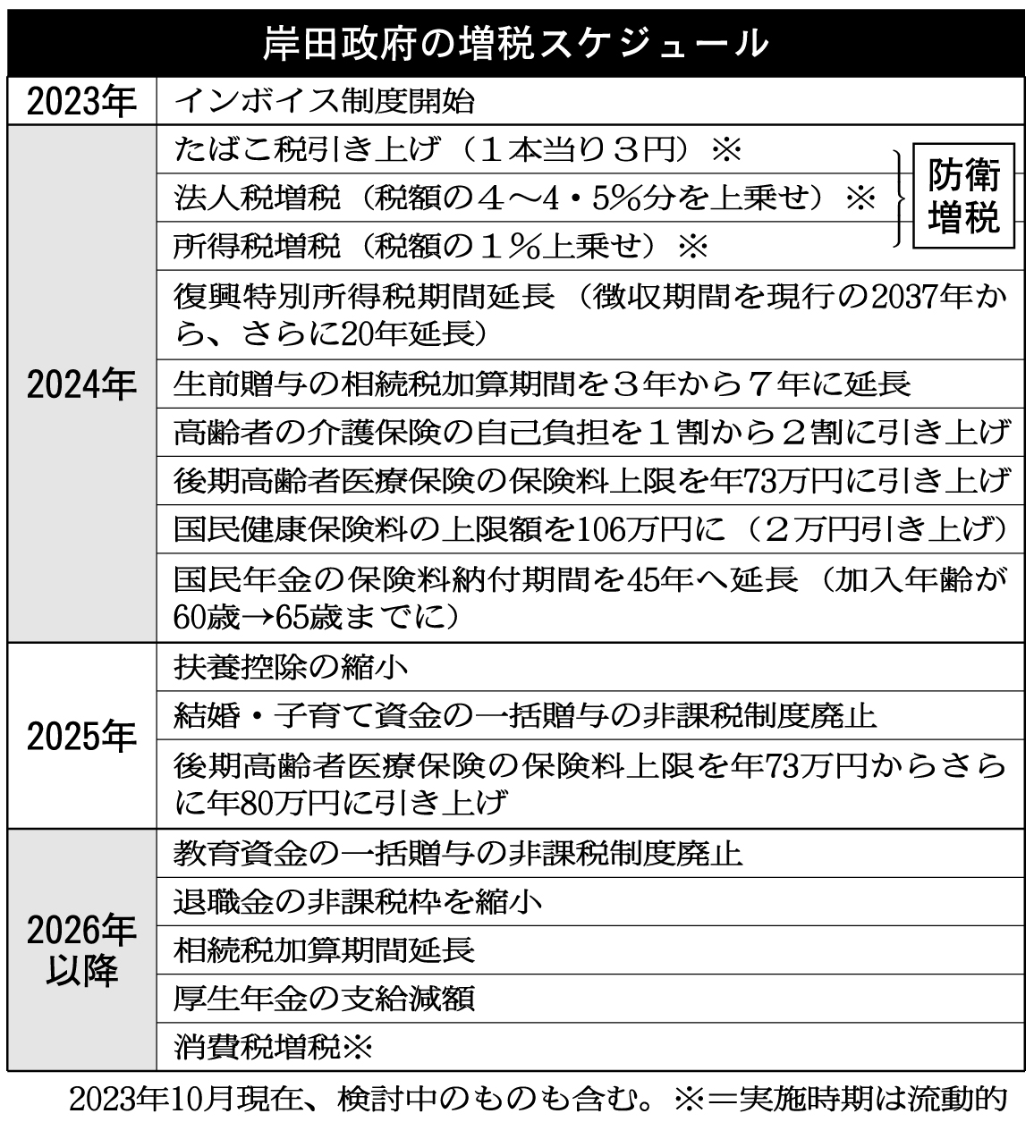 B 来年以降の増税スケジュール【下表参照】を見ても、お先真っ暗としかいいようのない増税・負担増のオンパレードとなっている。物価高は止まる気配がなく、モノの値段が上がるごとに10%の消費税負担も倍々ゲームで増していく関係だ。これのどこが「所得倍増」「分配と成長の好循環」なのか、「景気は確実に浮揚」などといっている経済アナリストたちにぜひ聞いてみたい。