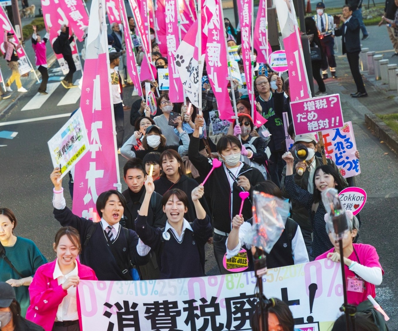 若い世代の参加が目立つれいわ新選組の「増税ダメ絶対」デモ(10月27日、宇都宮市)