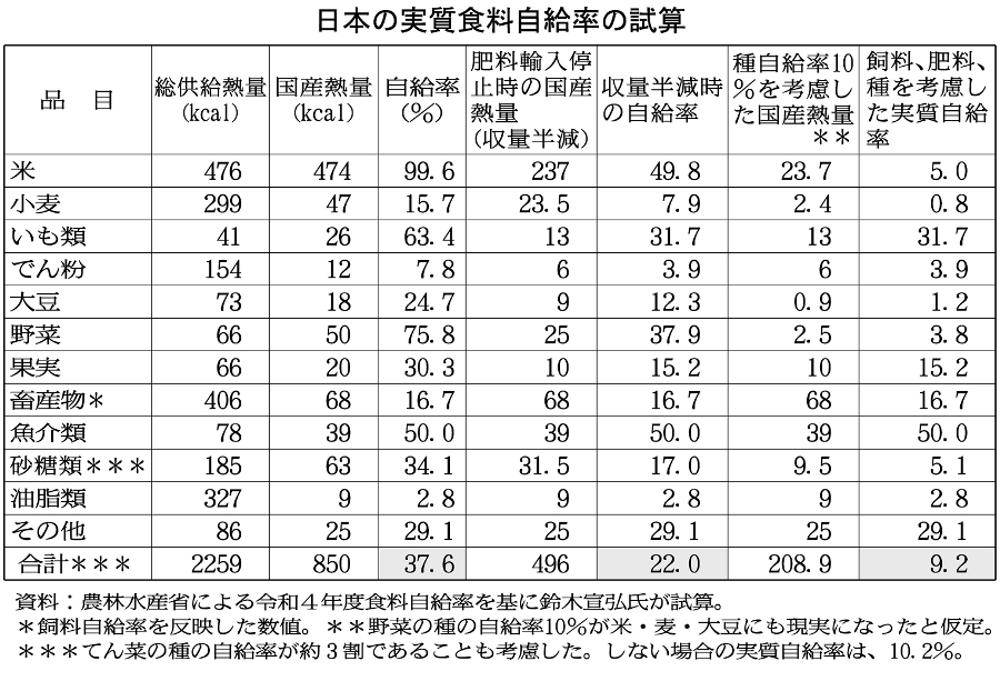 だから、自分たちの大事な種を国内で循環させる仕組みをつくらなければ日本は持たない。食料は命の源だが、その源は種だ。それを含めて、日本の食料自給率を再計算すると、38%の自給率は、もしも肥料が止まり収量が半分になるとすると22%に、そのうえ種も止められたら9・2%にまで落ち込む。