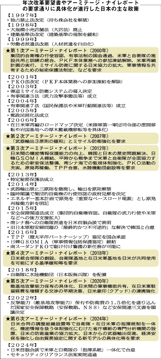 2000年に発表した第1次アーミテージ・ナイレポートでは活動領域を太平洋全域に広げた「安保再定義」について「日本の役割の下限を定めたと見なすべきで上限を示すものではない」とのべ「もっとダイナミックなとりくみ」を要求。そして集団的自衛権の行使容認、有事法制の国会通過、米軍と自衛隊の施設共用と訓練統合、PKF(国連平和維持軍)本体業務への参加凍結解除、米軍再編計画の実行、ミサイル防衛に関する日米協力の拡大、軍事情報共有にむけた秘密保護法制定等、多様な要求を突きつけた。