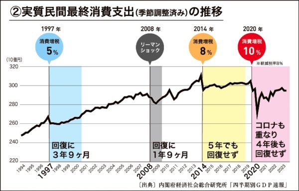 消費が落ち込むと、景気が後退する【図②】。消費税を5%に増税した後に落ち込んだ経済が、消費税を上げる前の水準まで回復するのに3年9カ月を要した。一方でリーマンショックは回復までに1年9カ月だ。また、消費税8%にした後は5年経っても回復していない。それなのに消費税10%に増税し、さらにコロナも重なって4年経っても回復していない。