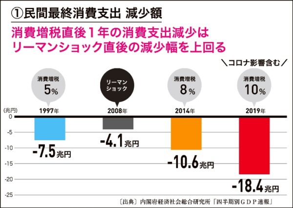 消費税を導入することで、経済が弱る。民間最終消費支出の減少額を見てみる【図①】。この国の一番大きなエンジンは個人消費、つまりあなたがお金を使うことだ。景気が悪くなると消費支出が減る。みなさんの記憶のなかで「不況がやってきた時」というと、リーマンショックのことを思い浮かべる人もいるのではないか。このときの消費支出の落ち込みは4・1兆円だ。一方、消費税5%に増税したときには7・5兆円減少だ。さらに消費税8%で10・6兆円減少、消費税10%ではコロナの影響もあり18・4兆円も落ち込んでいる。消費税とは、消費を弱らせ経済を弱らせるものだ。だから世界のどこを探しても消費税を上げるバカな国家は存在しない。