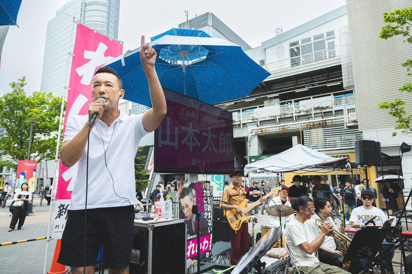 演説する山本太郎参議院議員(4月29日、秋葉原駅前)