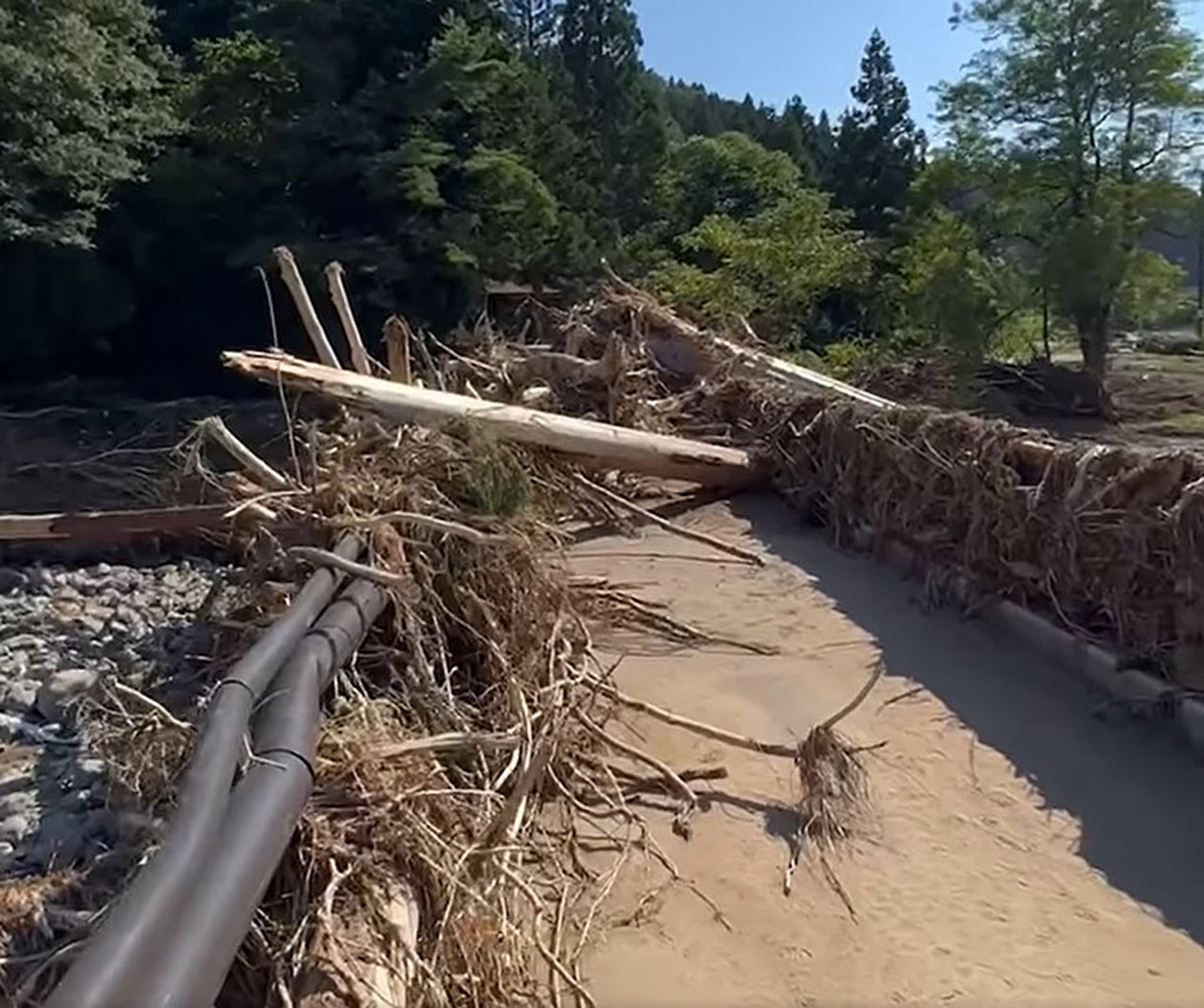 土砂崩れによって流された大量の流木が川を塞ぎ、家屋や田畑を呑み込んだ(5日、山形県酒田市)