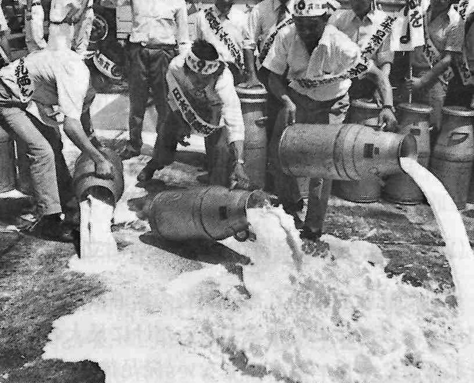 1975年7月8日、大手メーカの工場前で生乳投棄をして抗議する酪農家(『中央酪農会議20年のあゆみ』より)