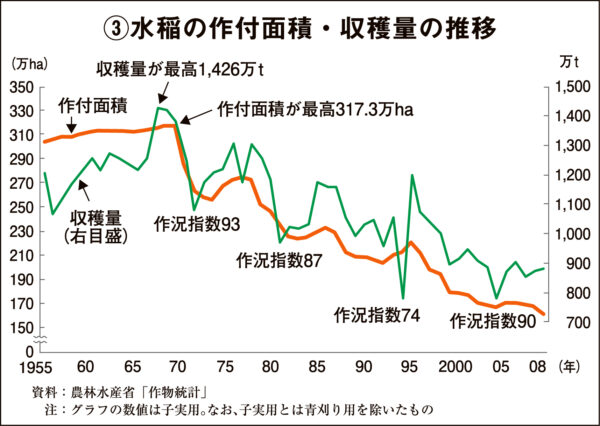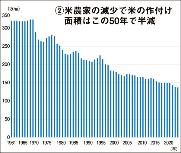 そして、コメに危険信号が灯り始めた。コメ農家はこの20年で急減し、100万戸も廃業した(2003~21年)。それによりコメの作付け面積はこの50年で半減している【グラフ②③】。