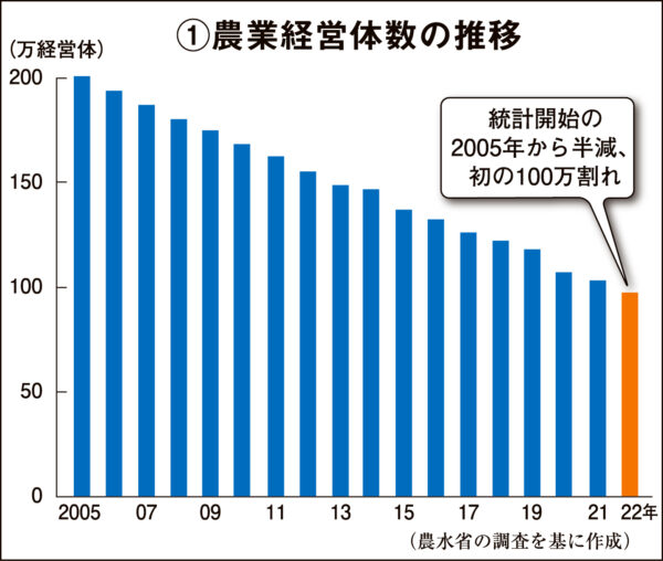今、農業の衰退に拍車がかかっている。農家数も農業人口もこの50年で5分の1に減少した。農地は最大だった1961(昭和36)年の609万㌶から2019年には439万㌶へと約169万㌶も減少した。このうち水田の減少が大きく、1961年から100万㌶もの減少となっている。農業経営体はすでに100万人を割っている【グラフ①】。