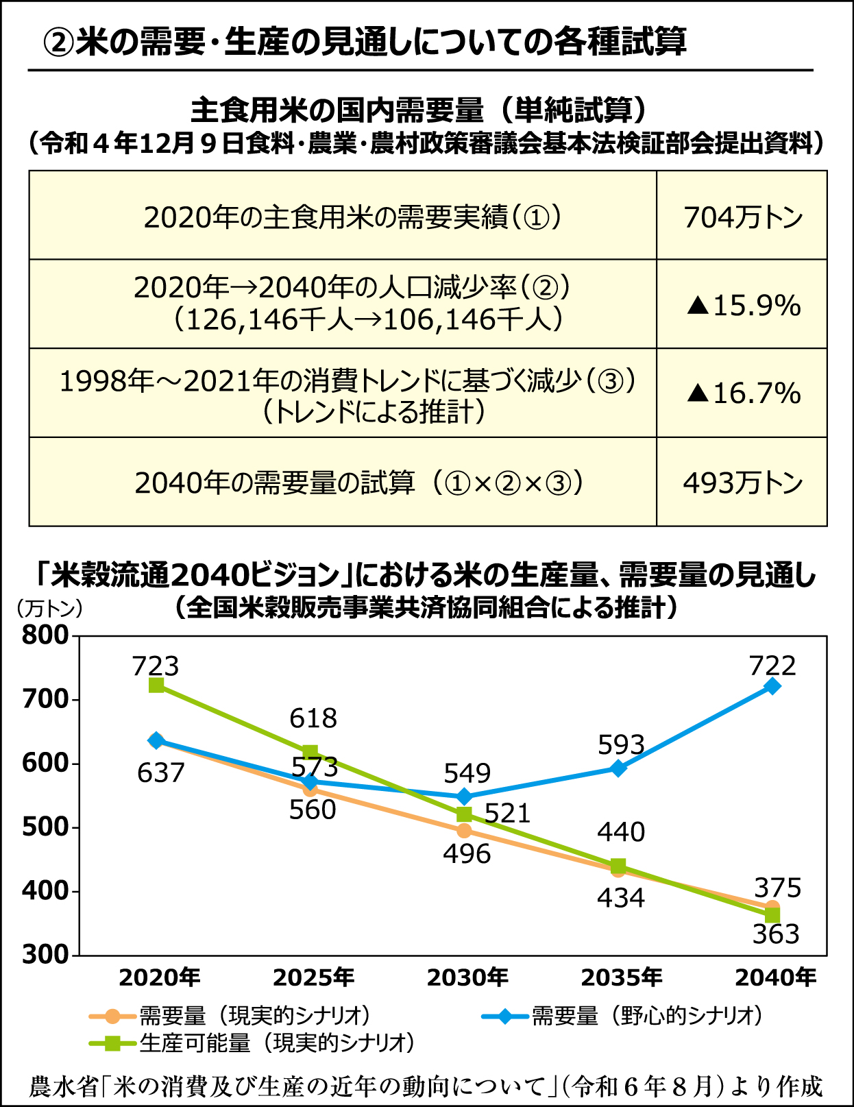 さらにコメの需要・生産の見通しについての各種試算が掲載されています。それによれば、 需要量は2040年まで722万㌧まで年々増えていく一方、生産可能量は年々落ち込んで同年には363万㌧まで落ち込んでしまうとの推計です。ということは、このままでいけば日本では2040年には359万㌧ものコメ不足に陥ることになります【図②】。