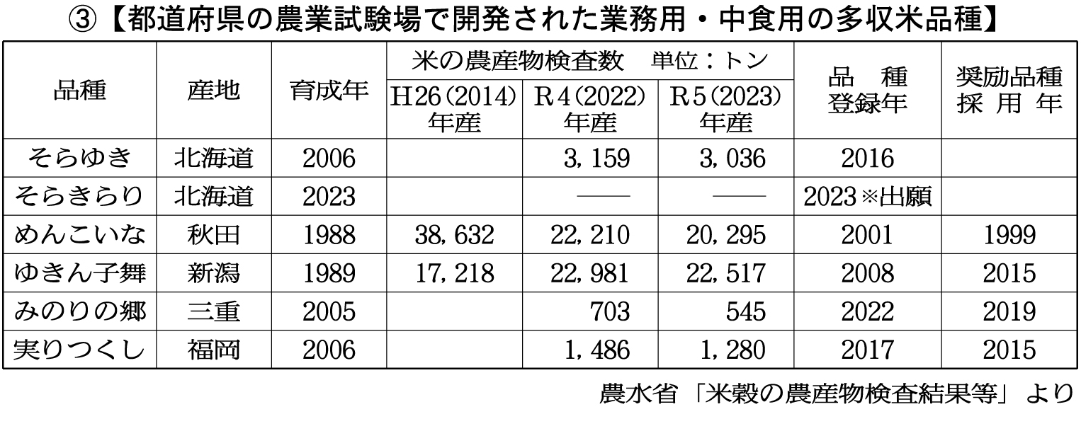 しかし私が調べた限りでは、次のように業務用、中食用に適した公共の種子がいくつも国の農研機構と各都道府県の試験場で開発され、農家に安く提供されて生産されていました。 今回のスーパーからコメが消えたことも、業務用、中食のコメの不足は一度も報道されなかったことからして明らかです【図③】。