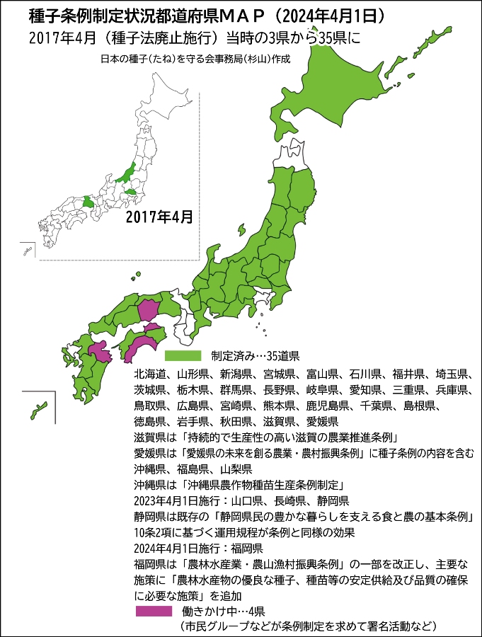 各地にもタネを守る会が次々とできてきて、2018年には新潟県、兵庫県等で種子条例が制定されたのです。最近、福岡県でも種子条例が成立、現在では35の道県で制定されるに至りました。