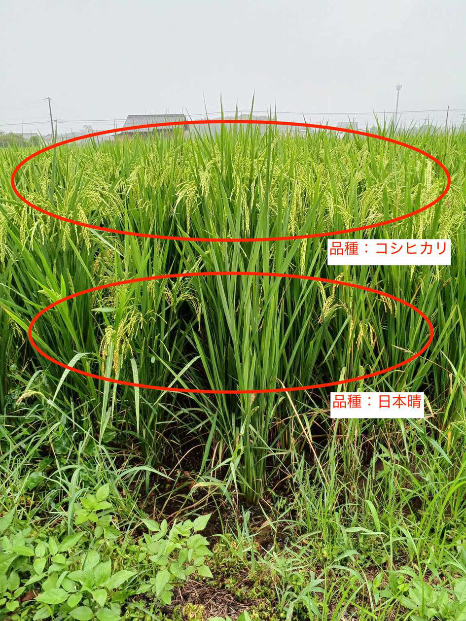 (参考)稲の写真_コシヒカリ、日本晴マーカー付き