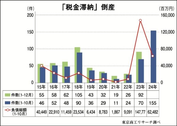 さらに看過できないのが、税金が倒産の引き金になるケースの増加だ。1~10月の「税金滞納(社会保険料含む)」が一因となった倒産は155件に達し、前年同期の2・2倍へと急増している。年間で最多だった2018年(105件)を7月で上回り、最多記録の更新を続けているところだ。日本年金機構の「令和五年度業務実績報告書」によると、2023年度の滞納事業所数は14万2119事業所で、適用事業所の5・1%を占める。