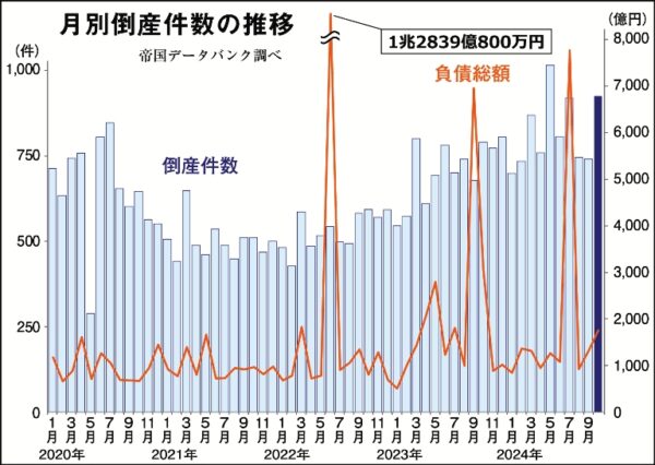 今年の企業倒産が、各産業で過去最多を更新し続けている。『東京商工リサーチ』の調査で、10月の企業倒産(負債額1000万円以上)は909件と昨年比で14・6%増加している。10月単月で900件台に達するのは2013年以来11年ぶりだ。上半期(1~6月)の段階で2014年以降で最多を記録していたが、その後も止まる気配はなく、10月までの累計で8323件、年間で1万件をこえる様相となっている。販売不振や赤字の累積、売掛金の回収難などを要因とする「不況型倒産」が約8割を占めており、なかでも中小零細企業の倒産が増加しているのが特徴だ。こうした状況のなかでも政府はなんら手を打たず、むしろ淘汰を促進する意図が透けて見える対応に終始している。