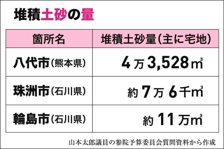 堆積土砂の量を見ると、八代が4万。珠洲、輪島は7万、11万だ【表参照】。