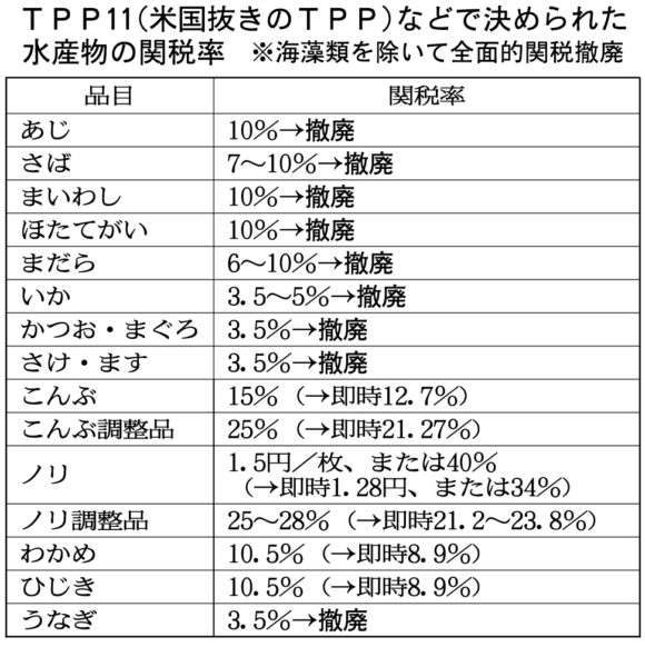 さらに水産物の平均関税率は4・1%にまで引き下げられ、米国抜きのTPP11では、水産物のほとんどの品目で関税撤廃している表参照。ノリなどの海藻類は15%の関税削減でとどめているが、その他は即時または段階的関税撤廃だ。こんなことを国民が知らないところで勝手にやっているのだ。輸入が増えれば価格は下がるのは当然で、その打撃の大きさを農水省も試算している。