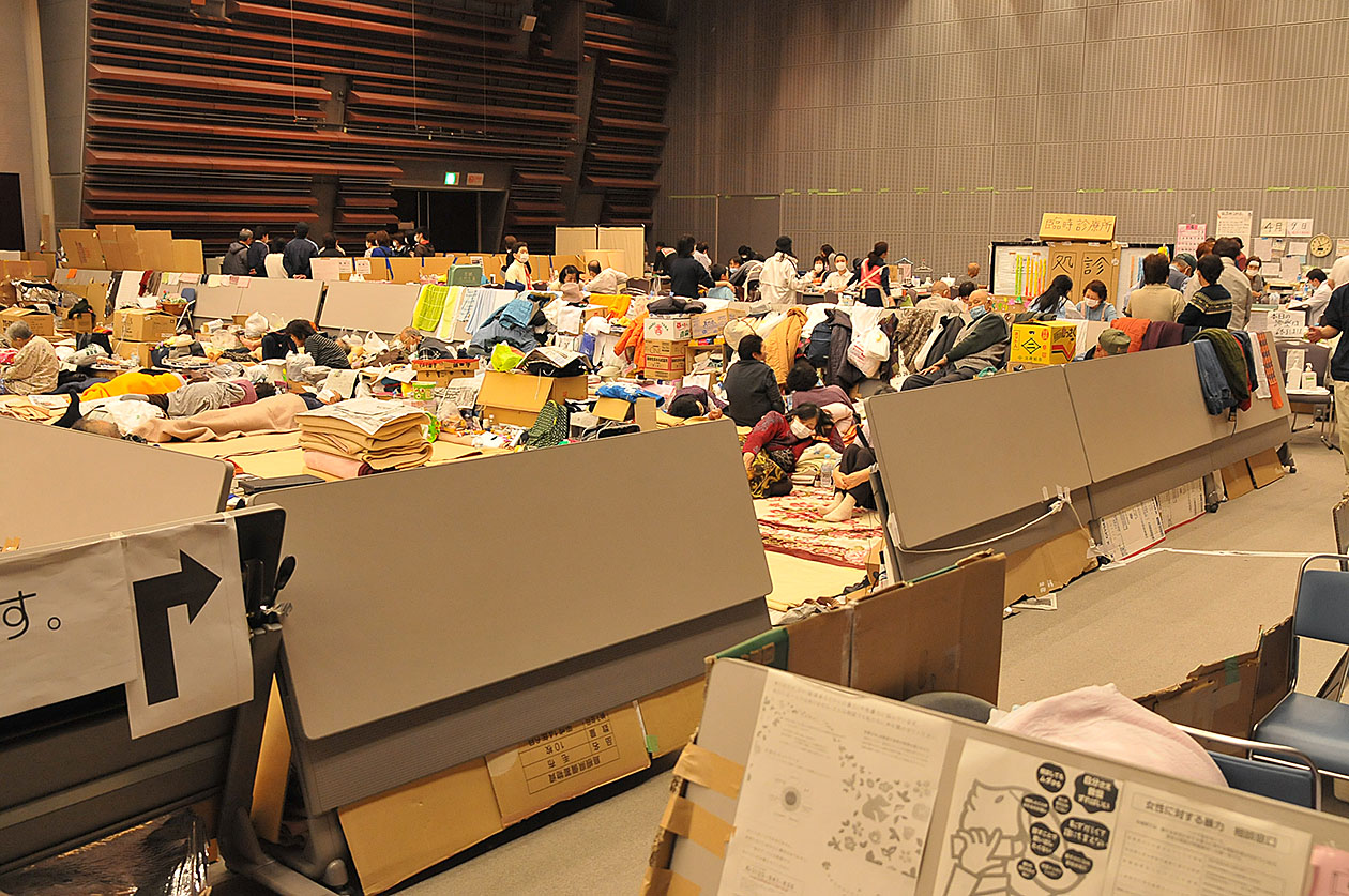 日本では災害時にはいつも体育館に段ボールで雑魚寝という避難生活が強いられる。写真は東日本大震災時の避難所の様子(2011年4月、福島県)