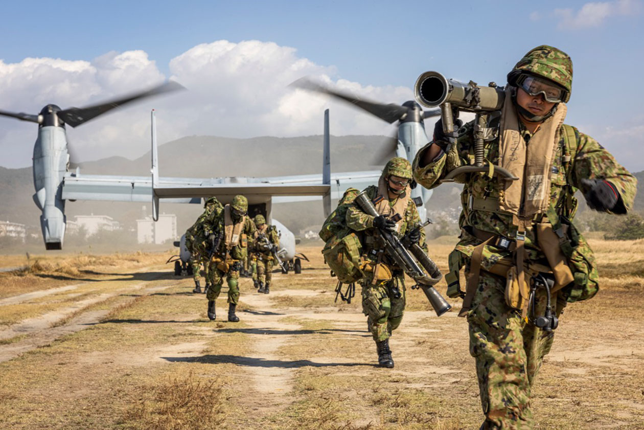 日米統合演習「キーンソード」で米海兵隊のオスプレイから降機する自衛隊員ら(2022年、長崎県佐世保市)