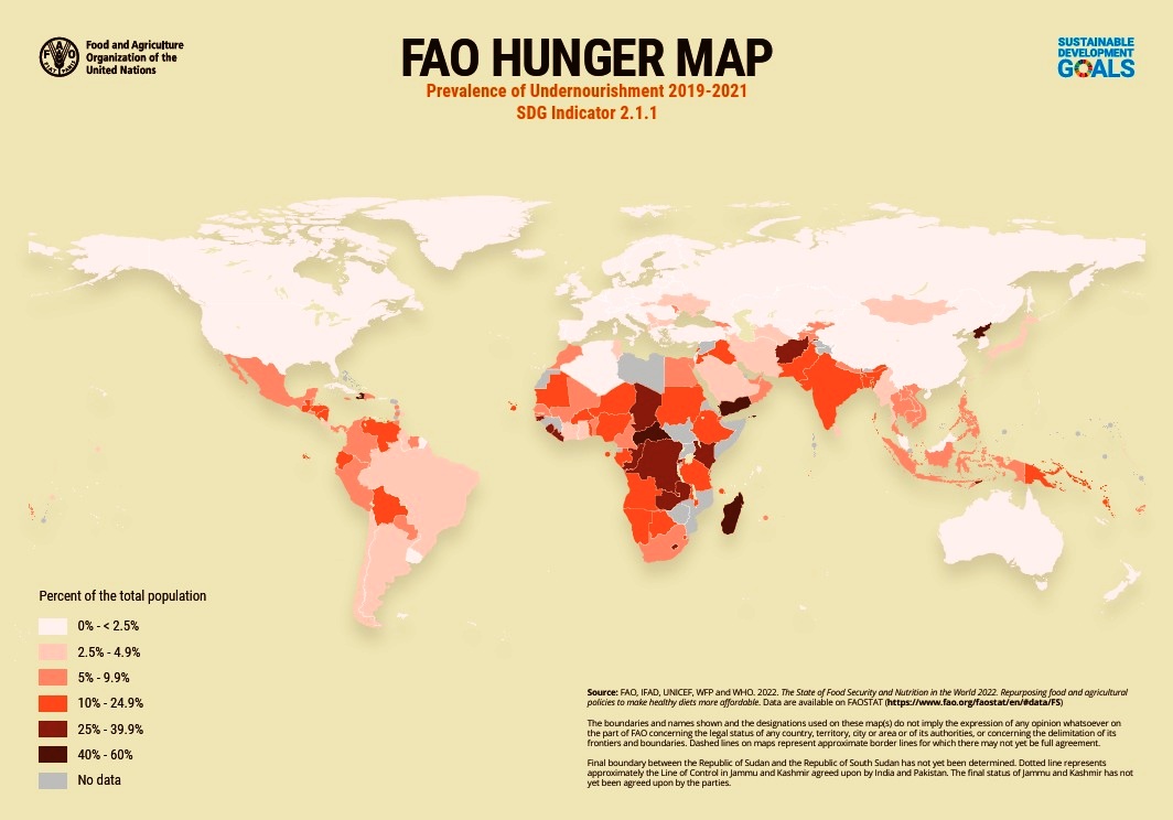 「日本はすでに国連FAOの飢餓マップでも、アフリカ諸国と同じ飢餓国の仲間入りを果たし、世界で最も栄養不足人口が多い国になった。」の根拠、引用元を教えてください。私も、食料アクセスの問題を危惧していて、鈴木先生の日本の食糧安全保障に対する主張を支援する者の一人ですが、FAOのHunger Mapでは、日本はデータなしとなっていて確認できません。