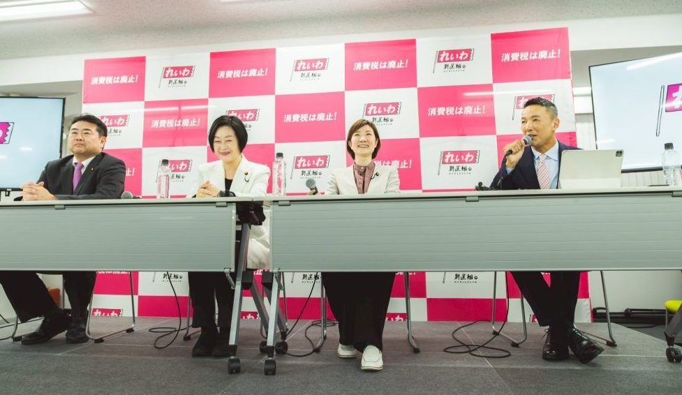 会見に同席したれいわ新選組の高井幹事長、櫛渕、大石共同代表(21日)