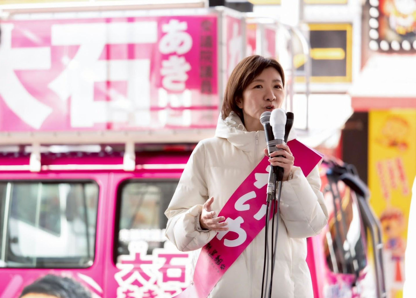 衆院選の第一声をおこなうれいわ新選組共同代表の大石晃子氏(1月27日、大阪・JR塚本駅前)