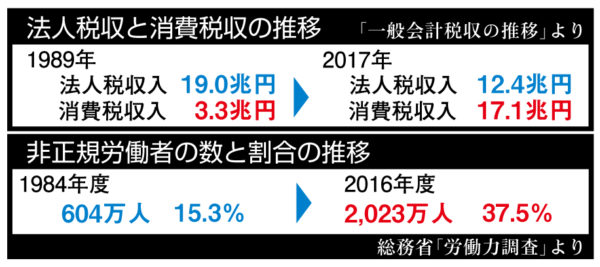 それを消費税で補うということになる。1989年、1997年、2014年と、消費税を上げる度にこの国に生きる人人、消費者、中小零細企業は首が絞まった。安倍総理は「倒産件数は減った」とドヤ顔でいうが、休業、廃業に追い込まれた中小企業は、安倍政府になってから何倍に膨らんだだろうか。