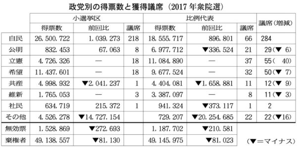 A 議席の変化を見てみると、自民党は改選前と同じ284議席(うち比例66)だった。そして民進右派が衣替えした希望の党が改選前の57から50議席(うち比例32)へと減らし、民進左派が衣替えした立憲民主党が改選前の15から55議席(うち比例37)に伸びた。唐突な解散劇の煽りを食ったのが公明党で、改選前の35から29議席へと減らした。さらに第2自民党のポストを希望に持って行かれた「維新」も11議席へと凋落して泡沫政党の仲間入りを果たした。「日共」も21議席から12議席へといっきに半減した。これは比例票がガタ減りしたことが原因だ。日本のこころは得票率が2%にも満たずに政党要件を失って消滅した。極右政党などといわれていたが、最後は代表の中山恭子・成彬夫妻が希望の党に逃亡して表舞台から姿を消した。