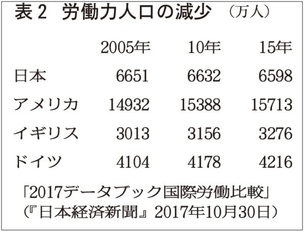 しかし重要なのは、社会的にみて、現在の日本では、労働力人口のベースになる生産年齢人口(15~64歳)が大きく減少していることである。表1でみるように、2005年~16年にかけ生産年齢人口は大きく減少(717万人減少)している。12年と比べても、361万人減少している。アベノミクスの中で少子化が進んでいるのである。
