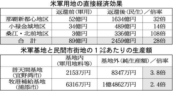 「沖縄は基地収入で自治体財政が潤っている」という論調が覆っているが、翁長知事が「それでは全国のみなさん、差し上げますがいかがですか?」と問うても全国どこも断る。それは軍用地の返還後に民間利用したときの経済効果の方がはるかに大きく、基地として使うことがいかに不経済であるかが明らかになっているからだ。