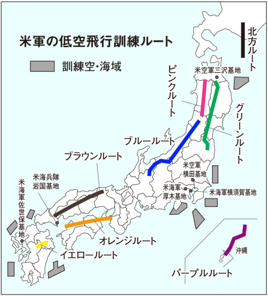 このラプコン以外にも、米軍の低空飛行訓練ルートが、北方ルート、グリーンルート、ピンクルートなど日本国土全体に及んでつくられている。日米地位協定によって設定された訓練エリアだ。米国本土では低空飛行訓練は国内法で禁止されている。日本は属国といわれながら米国の国内法は適用されない。日本の国内法があるのだが、日米地位協定には「免法特権」があるため、国内法は適用されず、低空飛行訓練ができる。そして戦闘機が基地間を移動するときも低空飛行してよいことになっているため、実質、日本のすべての国土で低空飛行がまかり通る。